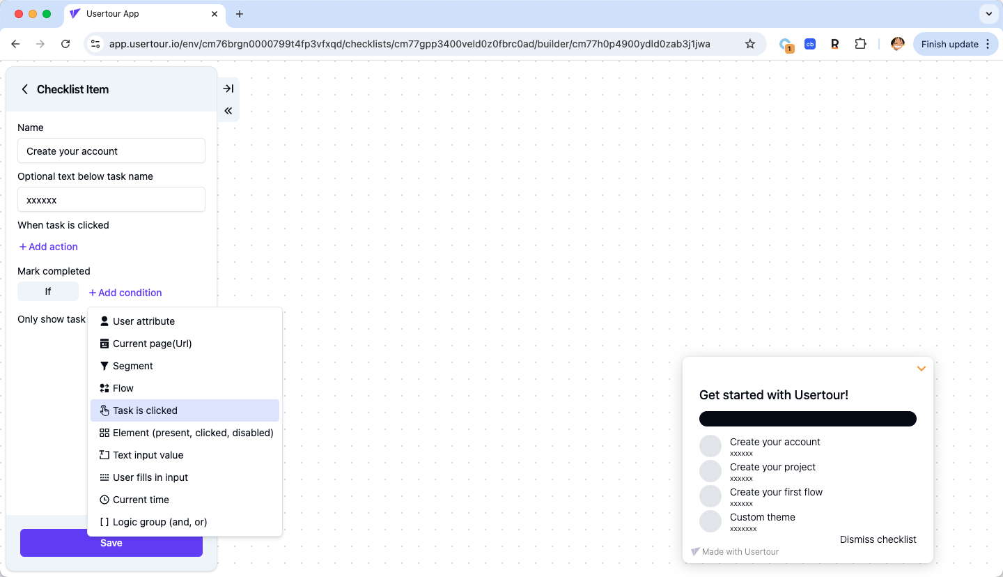 Control checklist visibility with temporary hide conditions:- Hide on specific pages