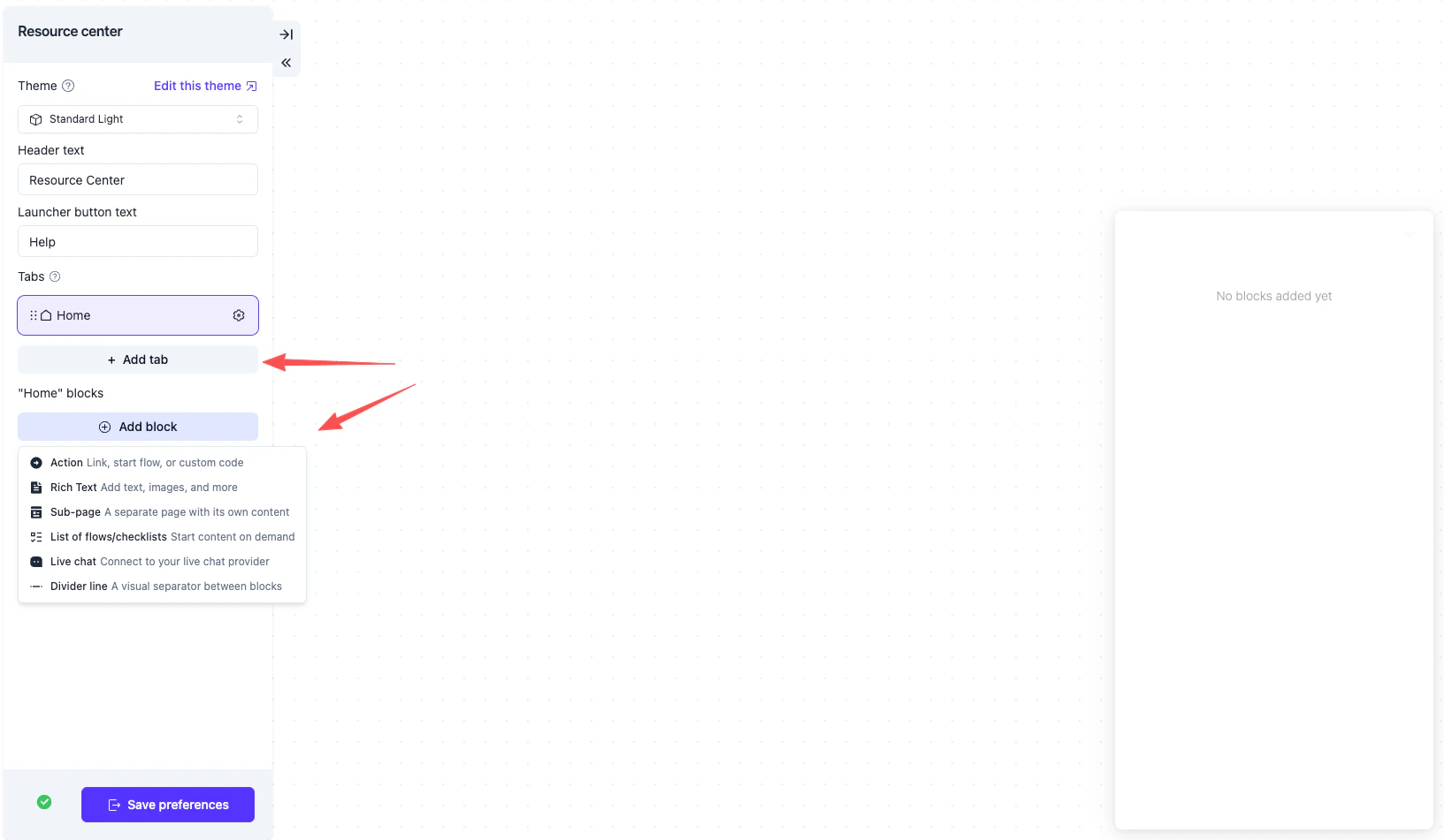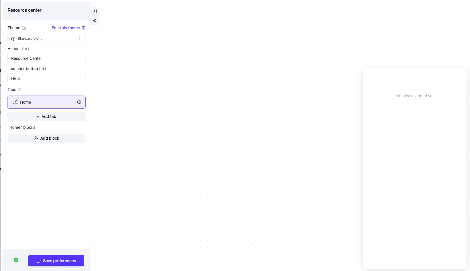 The Resource Center is a persistent, in‑app help hub that lives behind a launcher button in the corner of your app. Users open it to find onboarding flows, documentation, or reach out for support — all without leaving your product. It is built from tabs at the top level, with each tab containing one or more blocks that drive the actual interaction. Use the Resource Center when you want a single, always‑available entry point for help, instead of (or alongside) one‑off launchers and checklists.