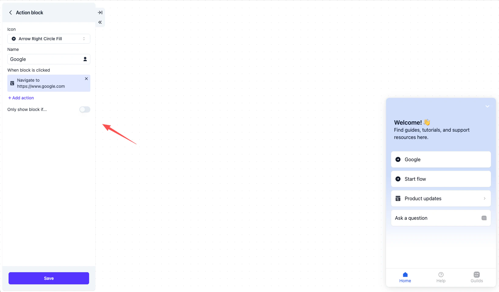 - Reserve Action blocks for true CTAs — buttons that fire and dismiss the panel (“Schedule a demo”, “Open changelog”). For navigation that should keep the panel open, prefer Sub‑page.