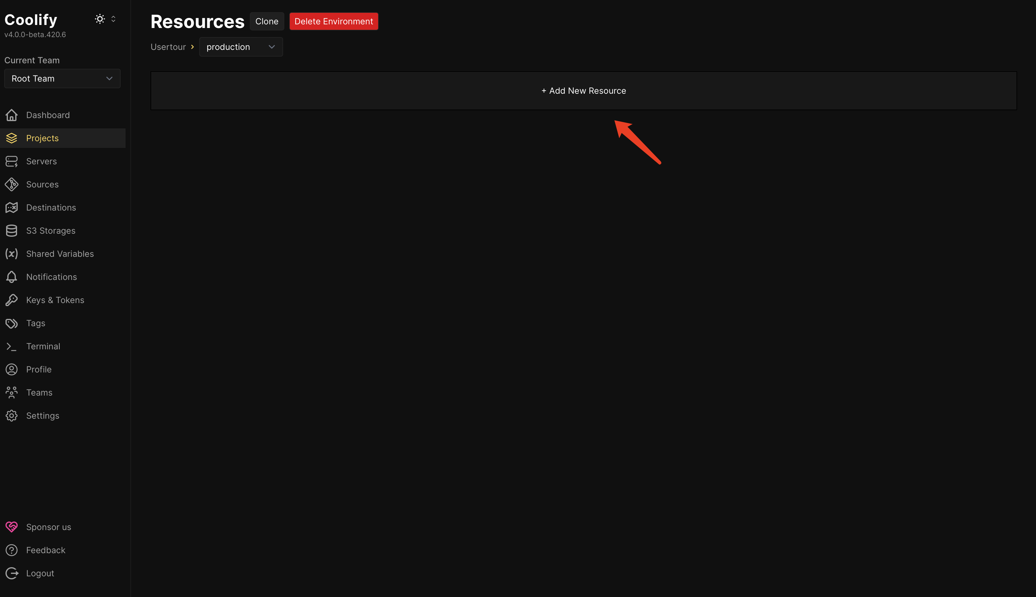 Navigate to your Coolify dashboard, open your project, and click the Add New Resource button.