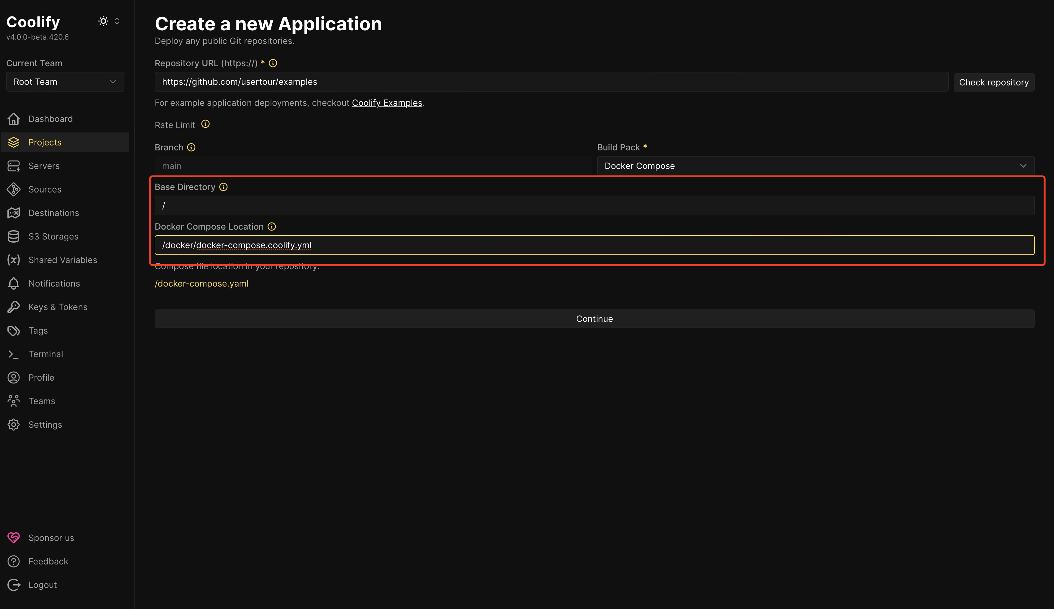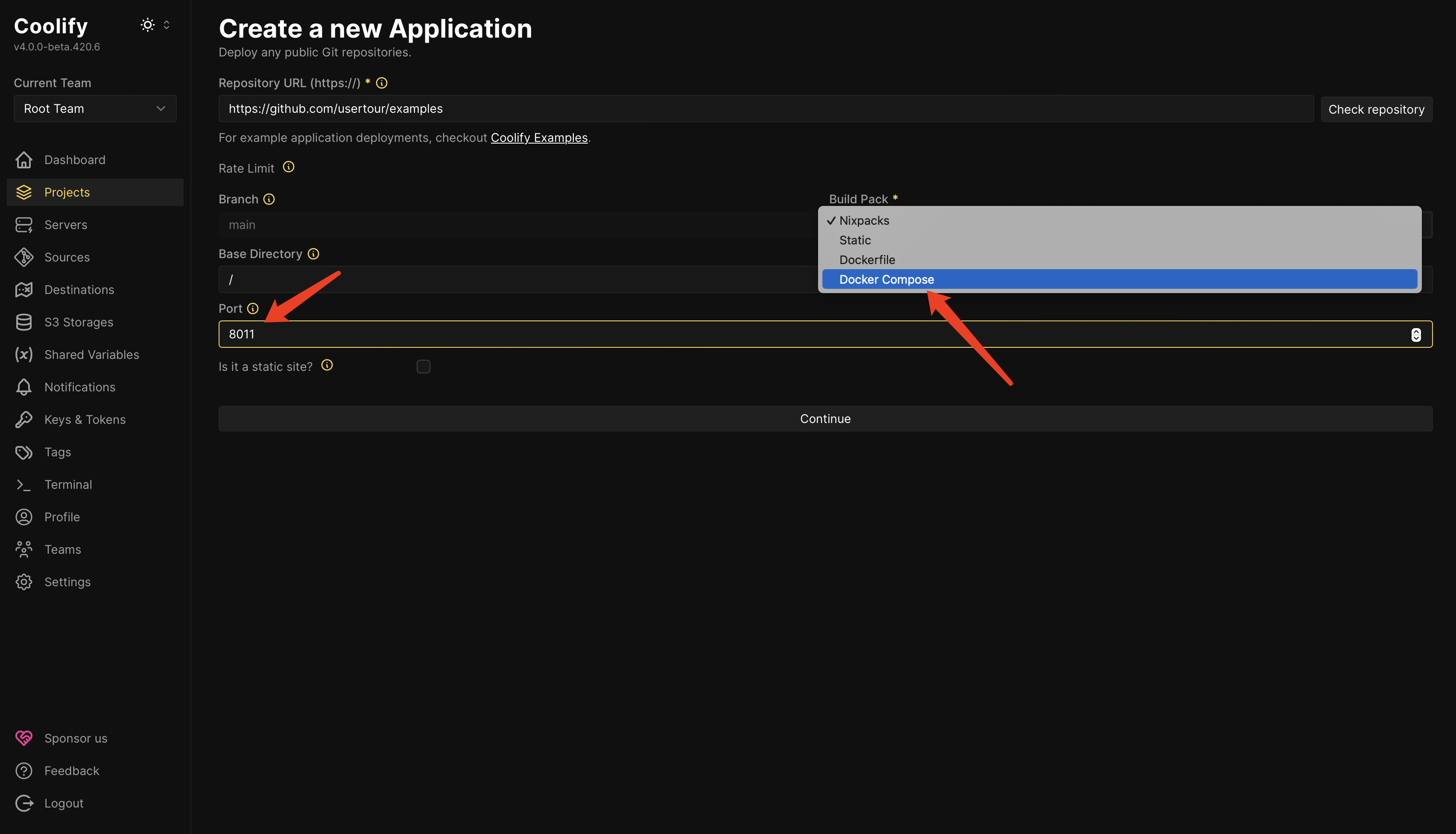 Choose Docker Compose as your build pack and click the Continue button.