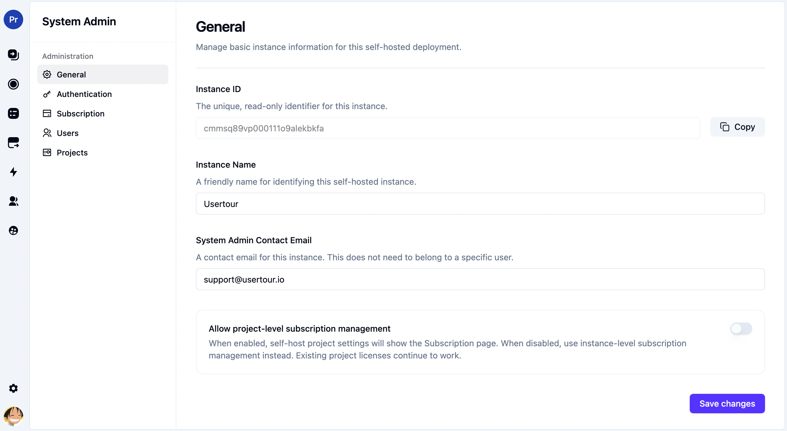 - Allow project-level subscription management Controls whether self-hosted projects show a project-level Subscription entry in project settings