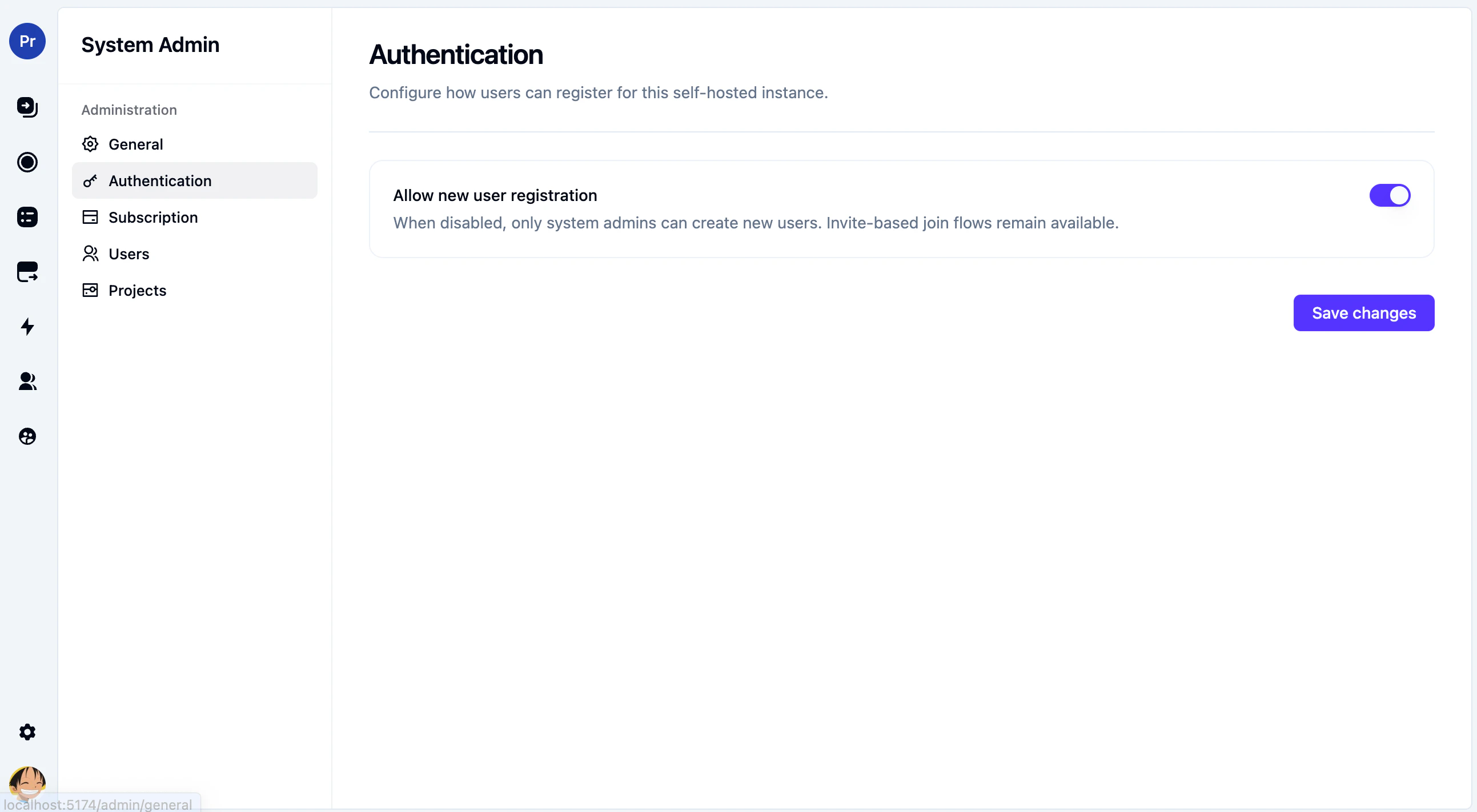 The Authentication page is intentionally small right now. It currently exposes one instance-wide policy:- Allow new user registration