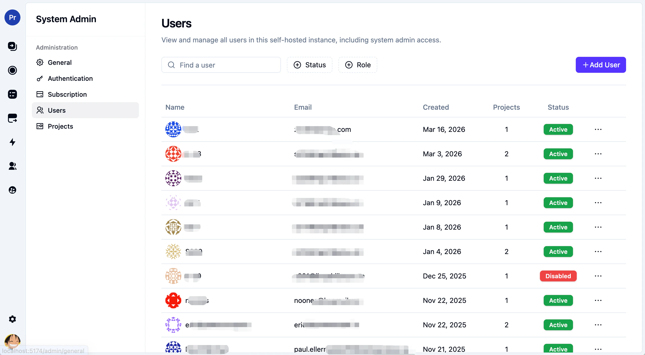 The Users page gives you instance-wide user management. This is where you can:- search users by name or email
